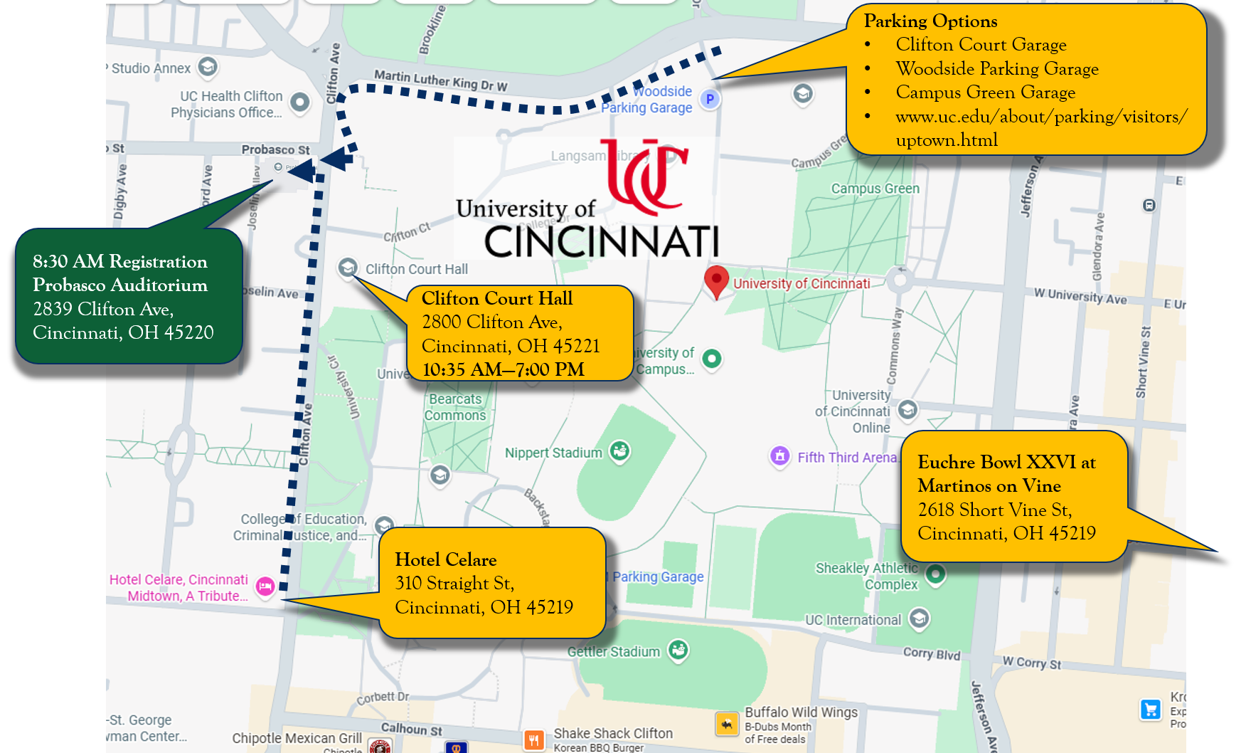Parking: For those staying at the Hotel Celare, plan to walk 6 minutes to Probasco Auditorium. For those driving in on Saturday, parking is available in the campus parking garages for $5.00. Search for: Clifton Court Garage, Woodside Parking Garage & Campus Green Garage. Click here to view parking rates for this parking deck.